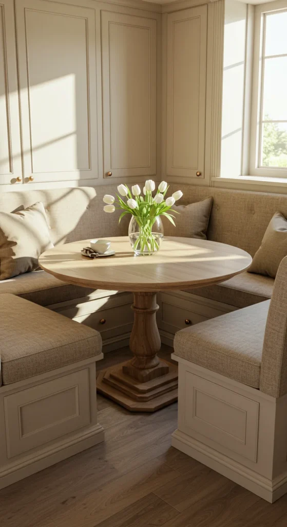 Banquettes save space and add charm. Perfect for cozy dining nooks. Upholster the bench for comfort and style. Add hidden storage under the seat. It feels intimate and practical, great for both casual breakfasts and dinners.
