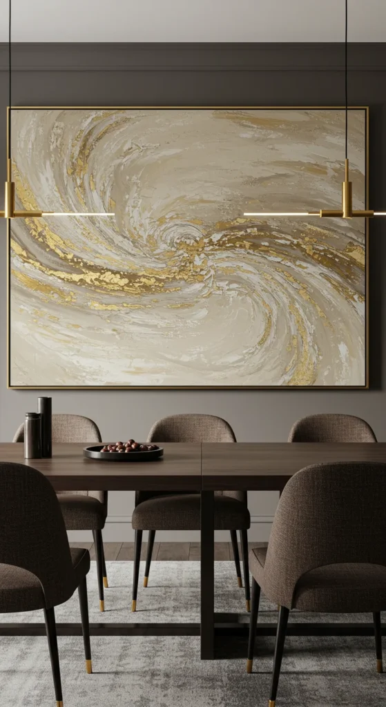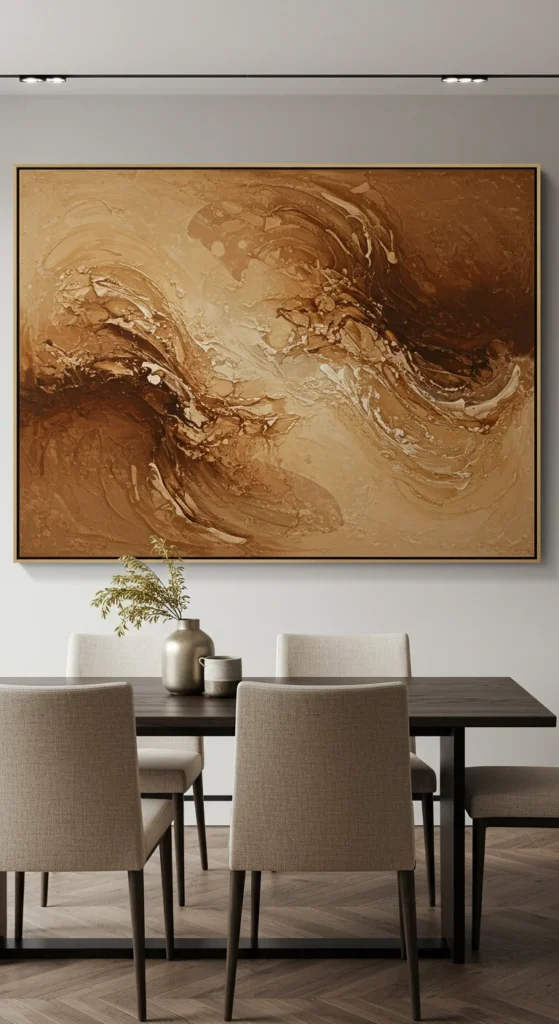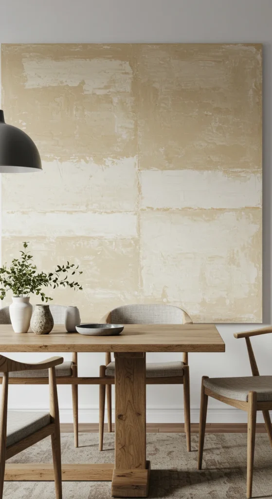 Textured art adds depth without color overload. Plaster, linen, or layered paint give subtle intrigue. Keep the palette soft so it blends with your dining furniture. The tactile surface adds warmth to clean walls.