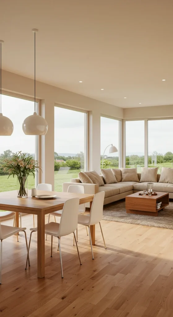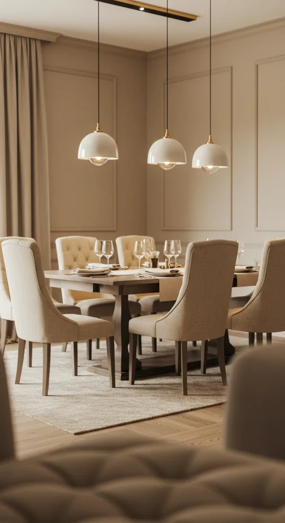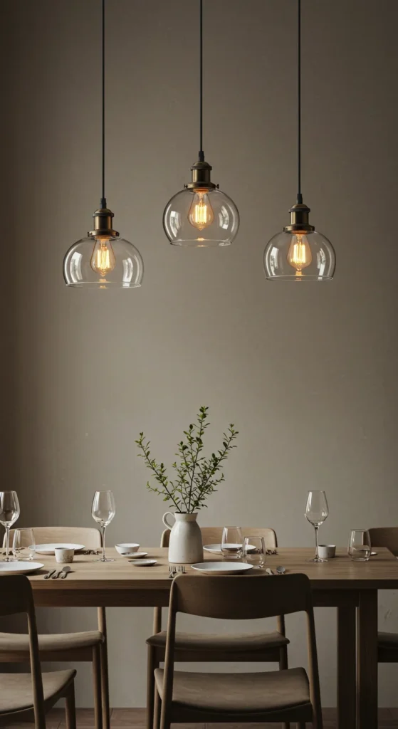 Clusters of pendants create intimacy and rhythm. Choose glass, brass, or rattan shades for warmth. Adjust heights slightly for dimension. This layered lighting feels custom-designed and draws attention to the dining table as the room’s focal point.