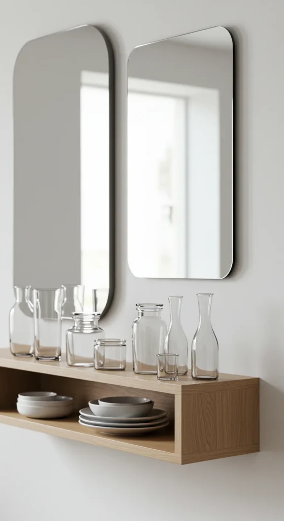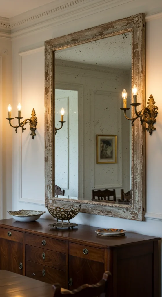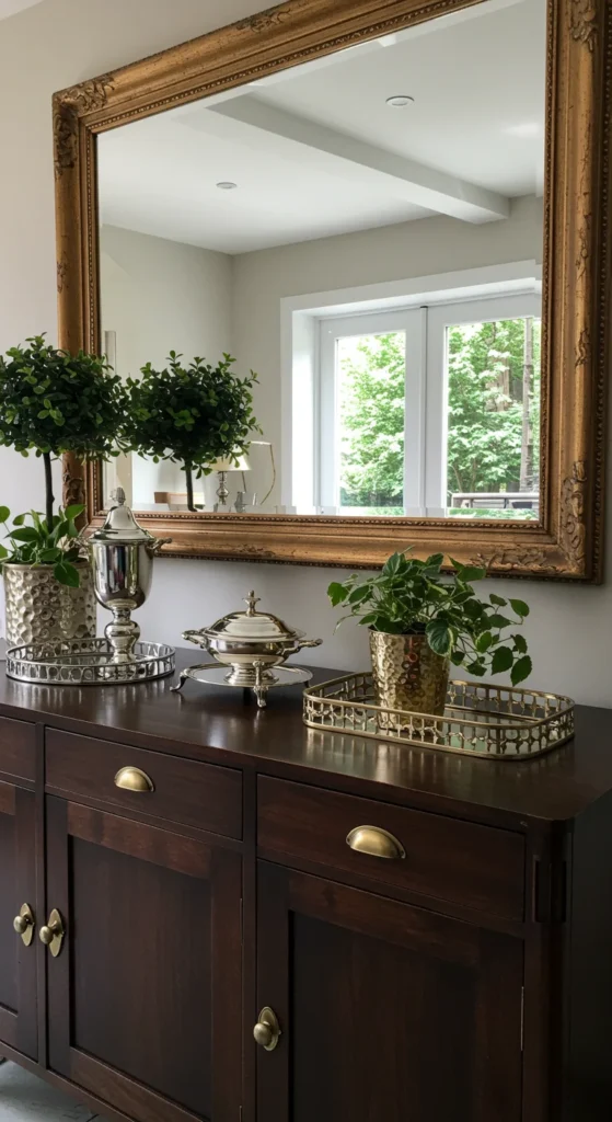 Mirrors open up smaller rooms by reflecting light. Hang one opposite a window or behind the dining table. Round mirrors soften square spaces. Choose frames that tie into your hardware — brass, black, or wood for cohesion.