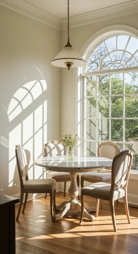 Round tables feel intimate. They encourage conversation and maximize small spaces. Marble, wood, or glass tops all work depending on your aesthetic. Center the lighting directly above for a perfectly balanced layout.