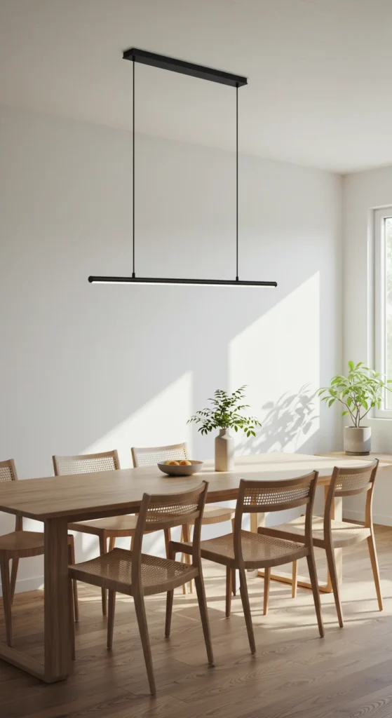 Modern dining rooms thrive on clean lines. A minimal ceiling light adds drama without clutter. Black or brass fixtures stand out against pale walls. Keep furniture simple to let the geometry of your light fixture shine.