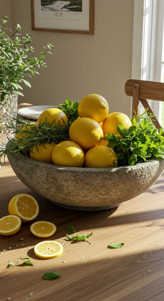 A large centerpiece bowl adds simplicity and presence. Keep it filled with fruit or seasonal elements like pinecones or branches. Choose bold materials — stone, ceramic, or wood. One well-chosen piece speaks louder than cluttered arrangements.