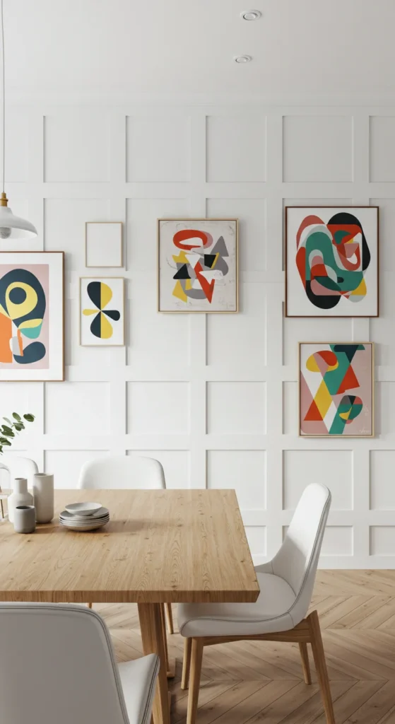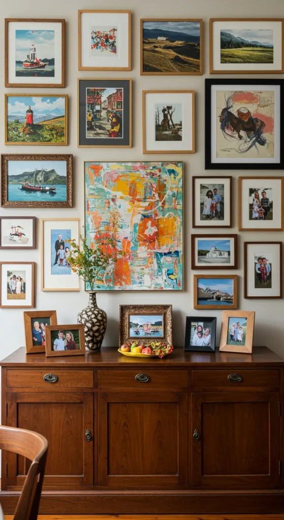 A gallery wall adds warmth and storytelling. Mix artwork sizes and frame styles for depth. Keep the spacing consistent for visual order. Include personal photos to make it feel intimate. The wall becomes a conversation starter during meals.