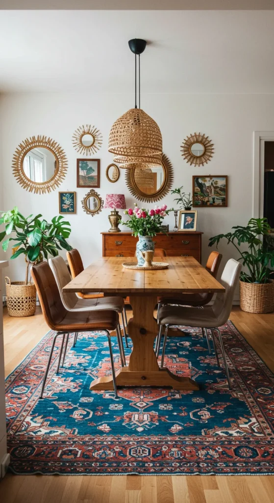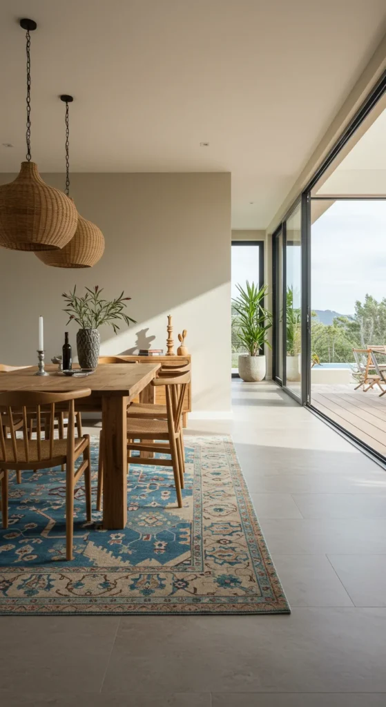 Boho dining feels relaxed and expressive. Combine natural materials like rattan, jute, and linen. Mix patterns subtly — one rug, one cushion, one art piece. The secret is imperfection that feels intentional and inviting.