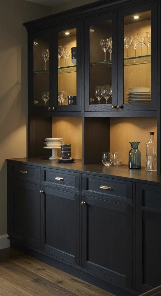 A built-in buffet combines storage and display. Keep lower cabinets for dishes and table linens, while upper shelves hold your prettiest pieces. Add under-shelf lighting to highlight texture and glassware. It creates a custom look that feels thoughtful and organized.