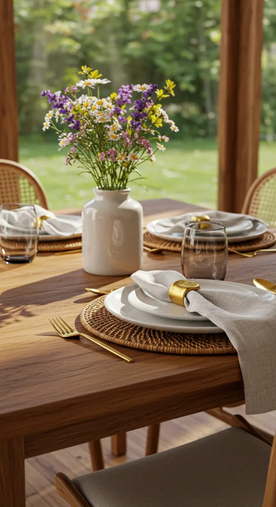 Texture makes every table setting feel thoughtful. Combine linen napkins with wood chargers and ceramic plates. Even everyday meals look styled. Keep a neutral base and add seasonal accents — greenery for spring or candles for winter.