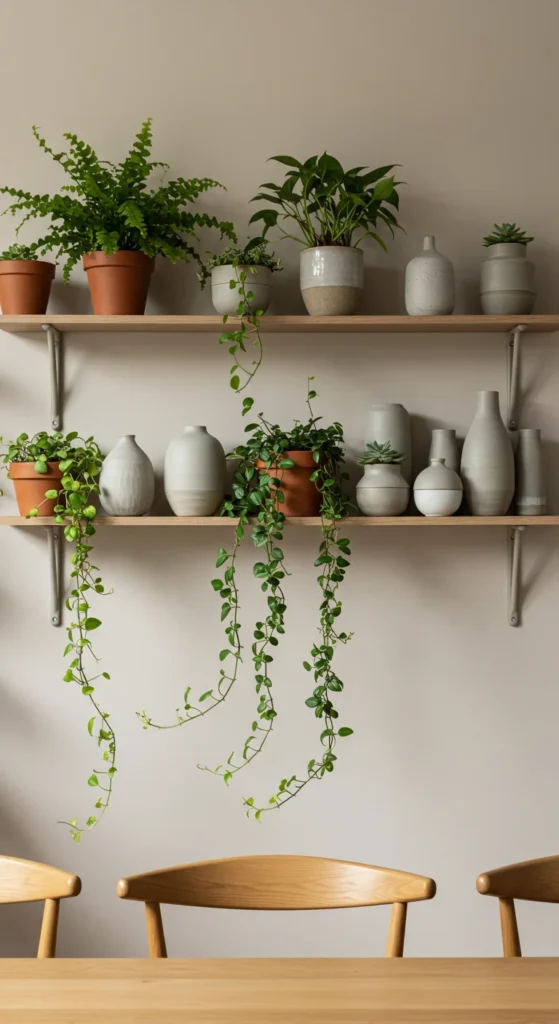 Plants soften sharp edges and bring freshness indoors. Install a floating shelf and mix different heights of greenery. Combine pots in similar tones for cohesion. Low-maintenance options like pothos or snake plants thrive in dining spaces.