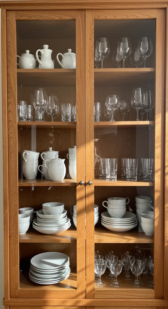 A glass cabinet makes storage beautiful. Display matching dishes, glassware, and textured ceramics. Keep it neat and color-coordinated. It’s functional art — useful yet decorative, especially when softly lit from within.