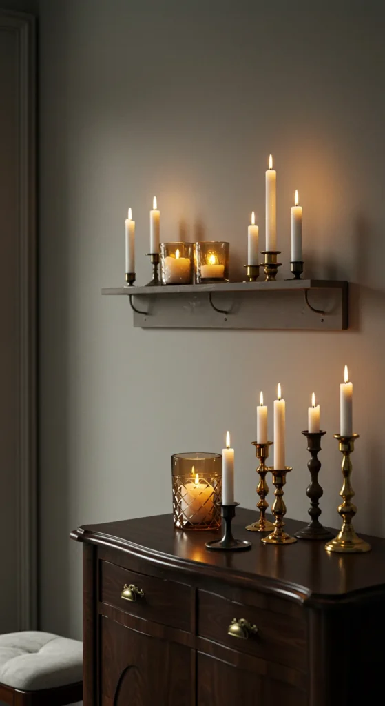A candle shelf doubles as soft decor and mood lighting. Mix heights and holders for variation — glass, ceramic, or metal. Light them during dinners for an ambient glow. The simplicity feels elegant and intentional.