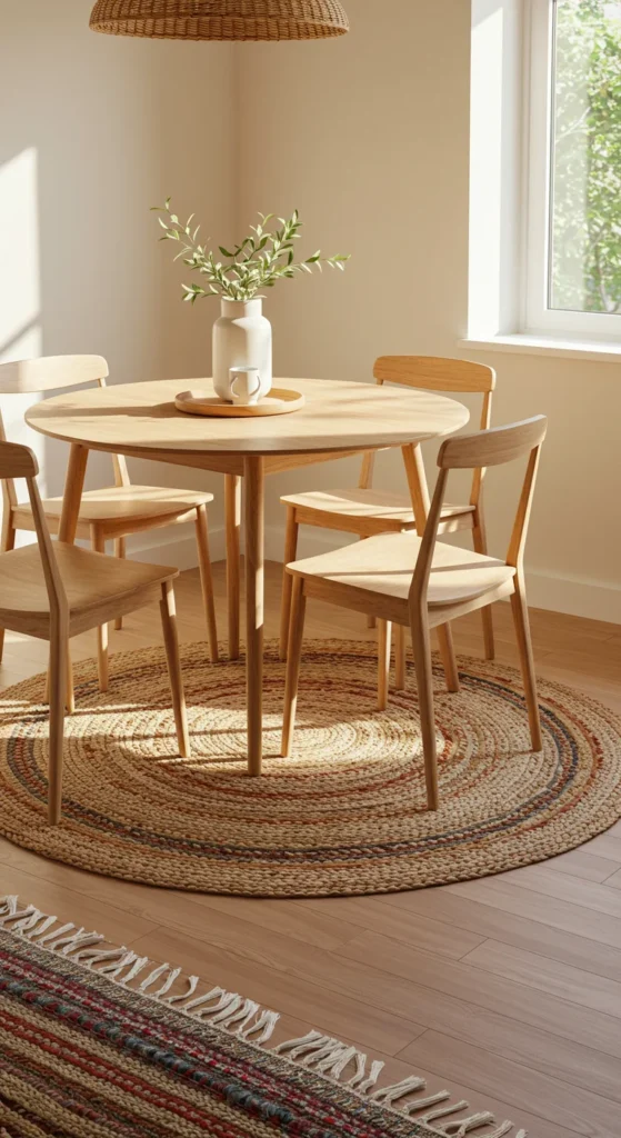 Round rugs anchor circular tables beautifully. They define the area while softening flooring. Choose natural fiber rugs for texture or low-pile styles for practicality. Make sure it’s large enough that chairs remain on the rug when pulled out.