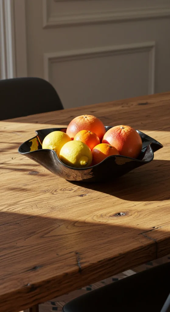 A centerpiece bowl is both sculptural and functional. Fill it with seasonal fruit or dried botanicals. Choose stone, wood, or ceramic for texture. It anchors the table even when not set for meals.