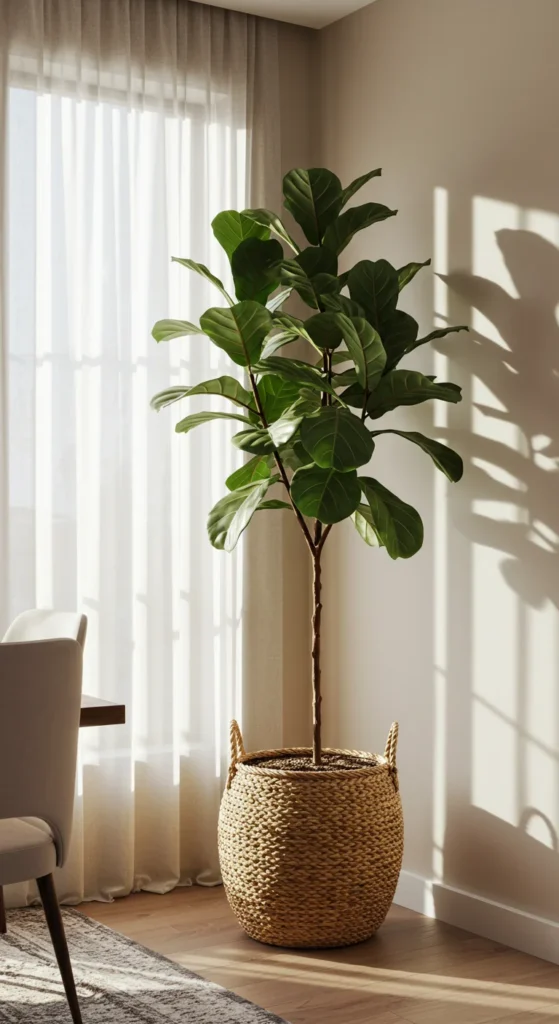 Plants in corners balance symmetry and add life. A single tall plant fills empty space beautifully. Pair with a woven or ceramic planter for natural texture. It’s simple, low-maintenance, and brings a calm, organic vibe.