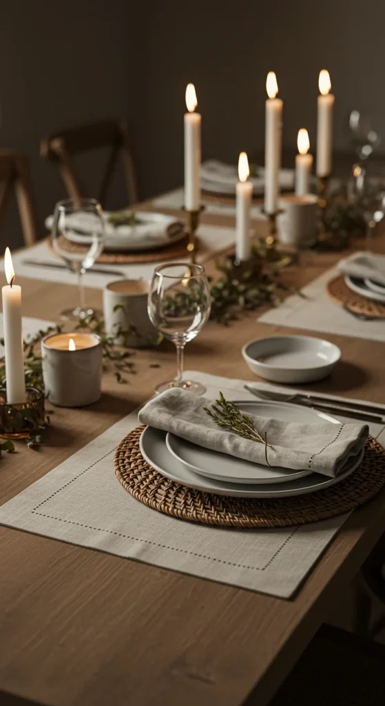 Simplicity can be stunning. Stick to quality basics — white plates, natural linens, and glassware. Add one focal point like a candle or single-stem vase. This uncluttered style makes everyday dining feel intentional and peaceful.