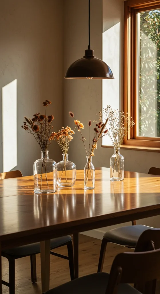 Candles create warmth instantly. Mix pillar and taper styles in varying heights. Place them down the table’s center for drama. Use unscented versions when dining. The flicker adds intimacy that no electric light can replace.