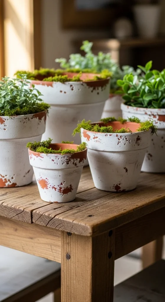 The soft chalky fade… the worn edges… the hint of mossy age distressed clay pots instantly bring that cozy shabby chic / farmhouse / French-country aesthetic into any space. And the best part? You don’t need antique planters or expensive décor to get the look.