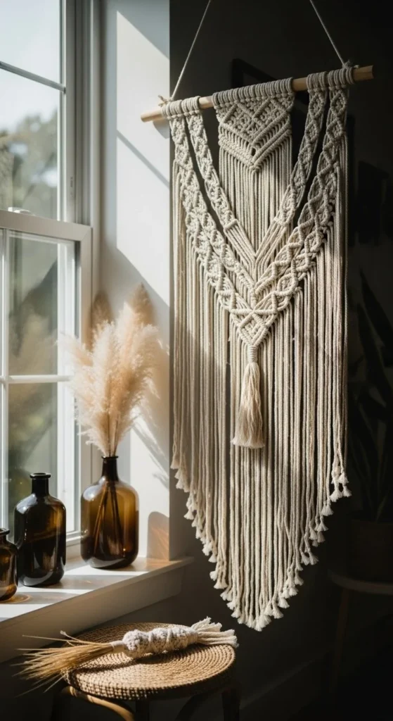 Spacing matters. Let the bottom edge float above furniture rather than touching it. This keeps the wall from feeling heavy. Pair macrame with natural fibers and open space. Avoid mixing it with glossy frames nearby. The contrast breaks the flow.