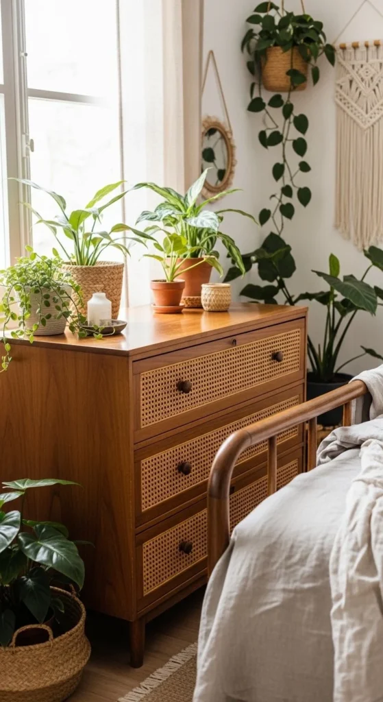 Thrifted furniture becomes boho-friendly with texture changes. Rattan panels lighten heavy wood pieces. Remove drawer fronts and cut rattan to size. Secure from the back with staples or glue.