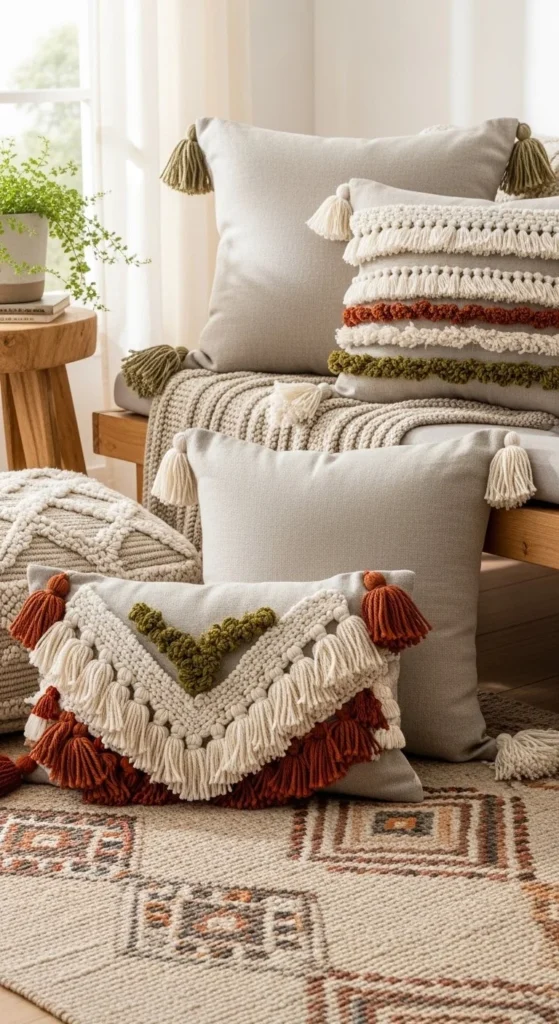 Plain pillows can feel flat in boho spaces. Tassels solve that quickly. Add them along seams or corners rather than across the center. This keeps the look grounded.