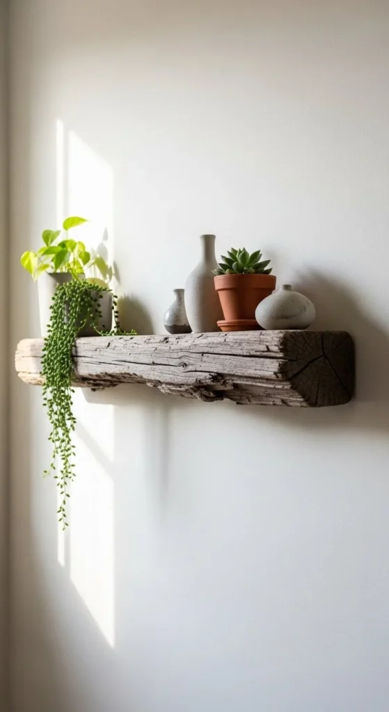 Driftwood shelves bring nature indoors without decoration overload. Choose a plank with texture but a flat top. Sand lightly to remove splinters while keeping character.