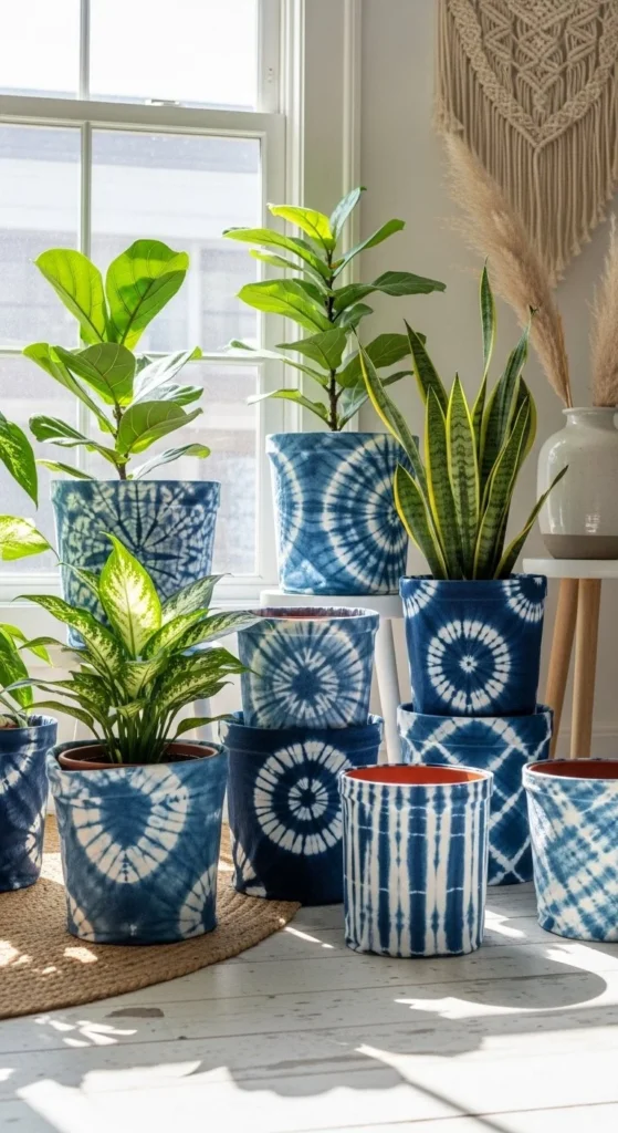 Fabric covers soften hard pots. Shibori dye adds pattern without loud color. Wrap fabric around existing planters and secure with stitching or ties.