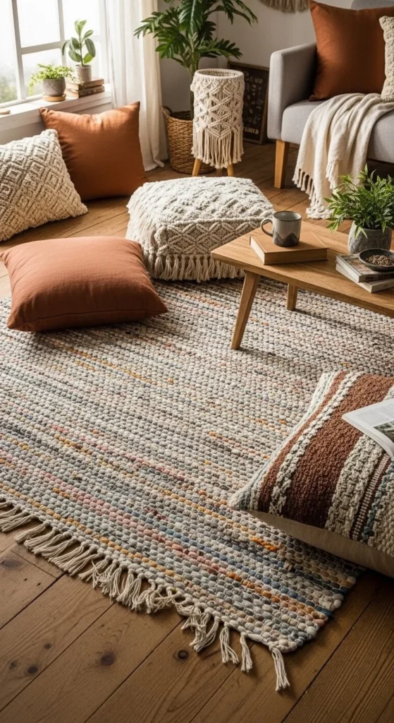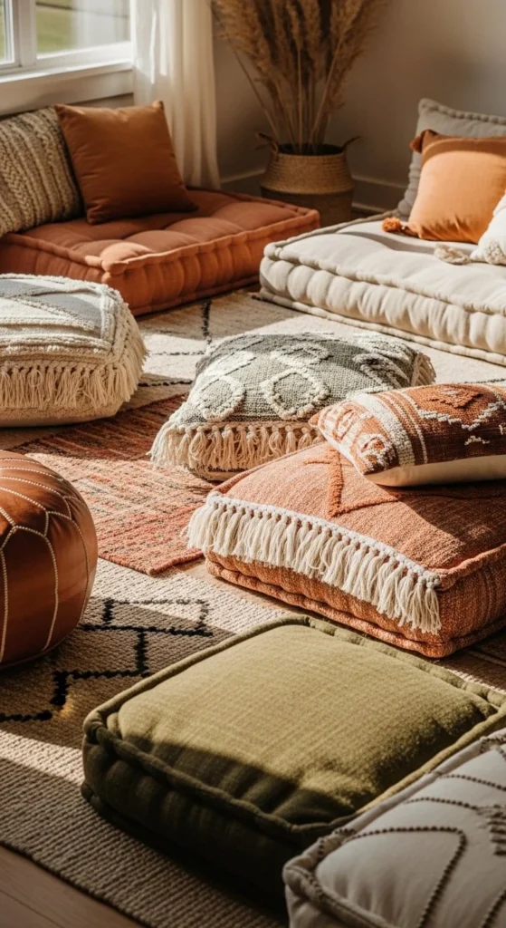 Floor seating encourages relaxed layouts. Start with one rug as the base. Add cushions in varied shapes. Keep colors within one palette.