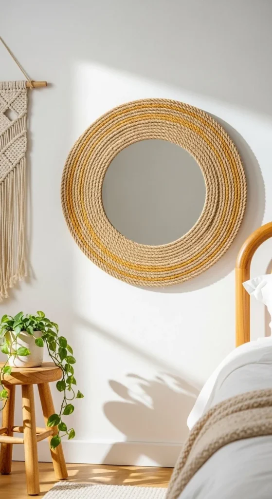 A rope frame changes how a mirror reads. It shifts from reflective object to textured decor. Start with a plain mirror. Wrap rope evenly around the edge, keeping tension consistent.