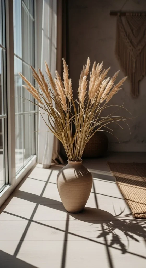 Dried grasses add height without effort. Faux versions solve maintenance issues. Choose stems with irregular shapes and muted tones.