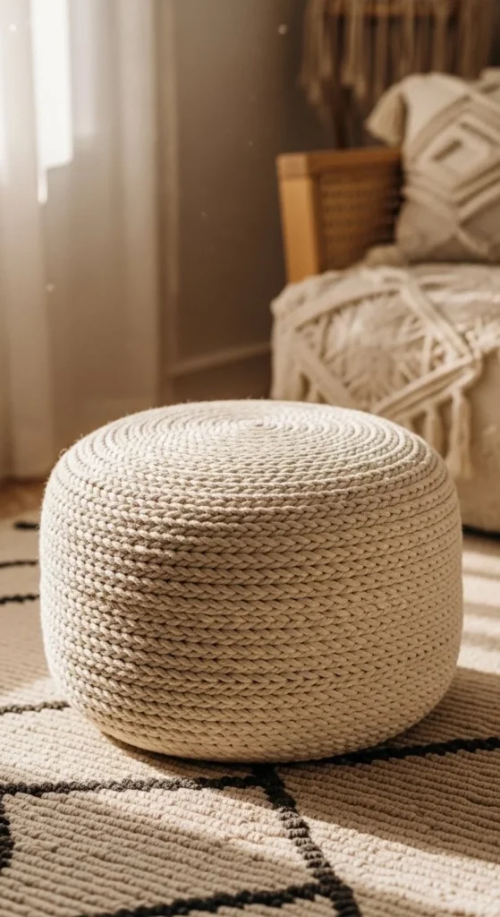 Rope ottomans combine seating and texture. Start with a sturdy base like a wooden stool or plastic crate. Wrap rope tightly from top to bottom.