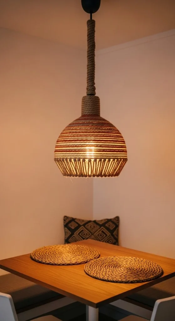 Choose thicker rope for bold texture. Thinner rope gives a lighter look. Keep gaps minimal so the bulb doesn’t show harshly. Warm bulbs work best here. White light feels out of place with rope and wood.