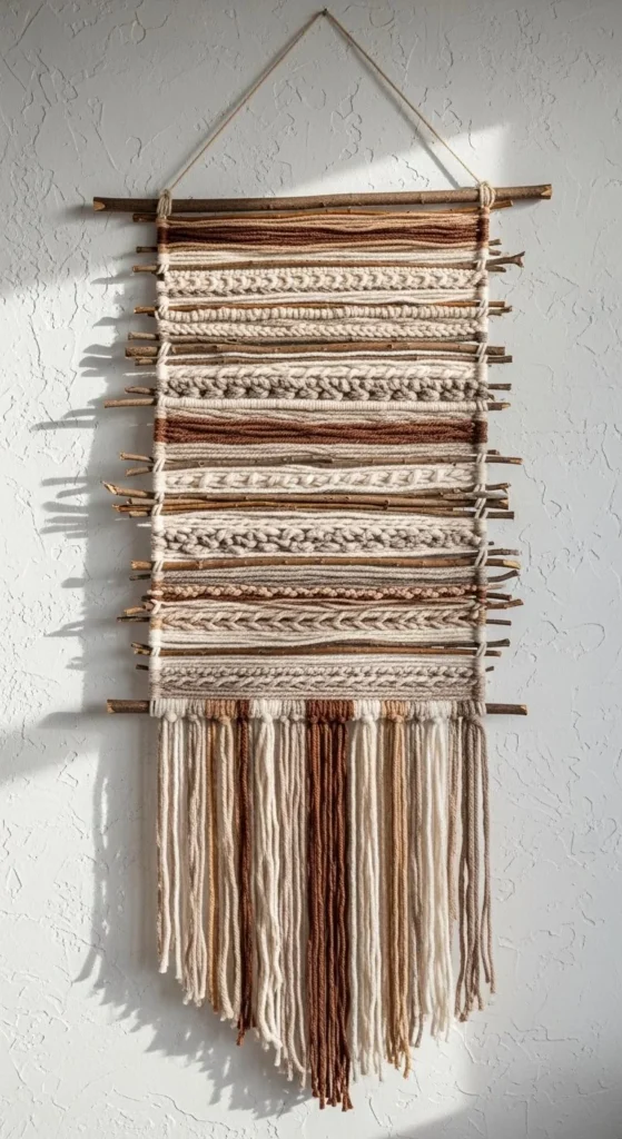 Keep the weaving uneven. Perfect lines remove the handmade feel. Use muted tones so materials stay the focus. This piece works best on blank walls where texture feels missing.