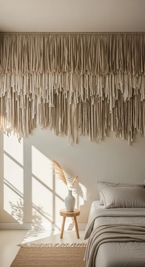 Keep fringe short for a cleaner look. Long fringe feels heavy on walls. This works best near ceilings or above beds.