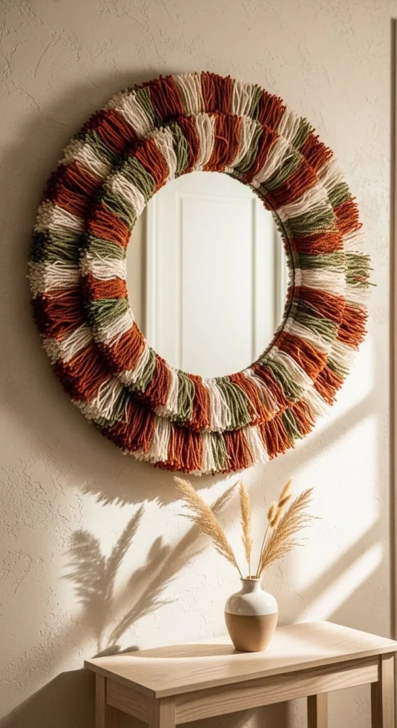 A simple mirror becomes expressive with fringe. Tassels introduce movement and softness. Start with a basic mirror from a thrift shop. Glue yarn tassels evenly around the frame edge.
