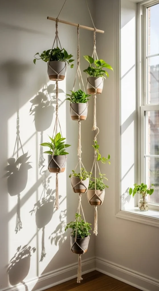 This setup fits apartments and small rooms easily. One dowel can hold several plants. Multiple dowels can form a loose row. The result feels airy, balanced, and rooted in natural rhythm.