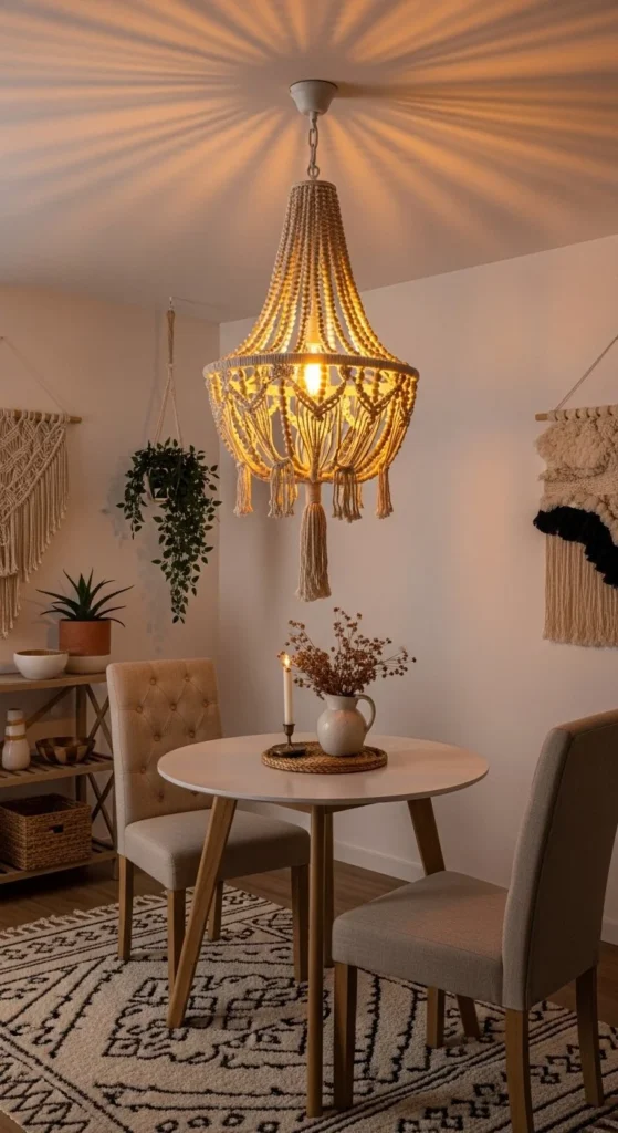 Lighting shapes the mood of a boho room. Jute rope pendants add texture while keeping the palette grounded. You can wrap rope around an old lampshade frame or metal basket. Secure it with hot glue in tight rows.