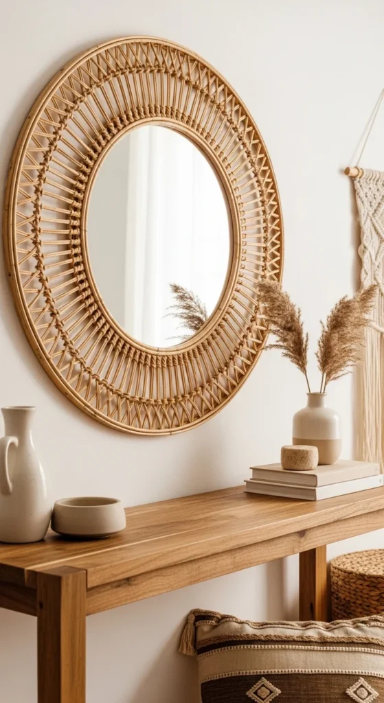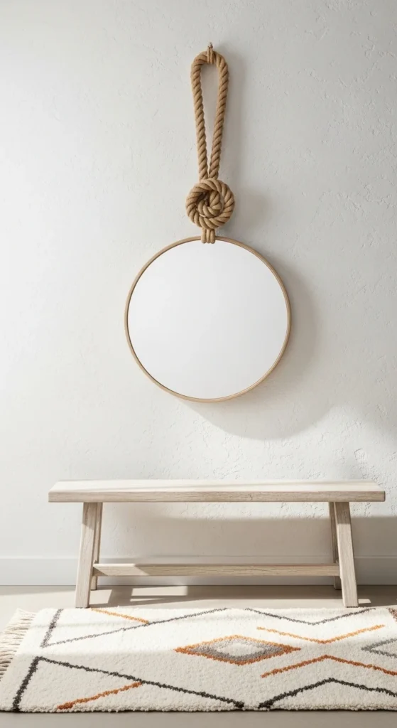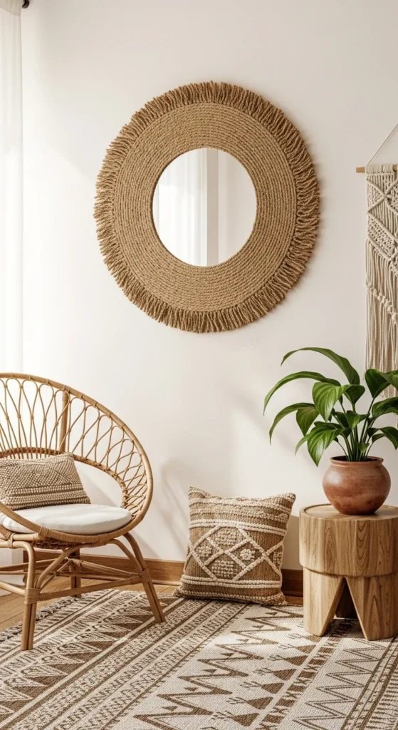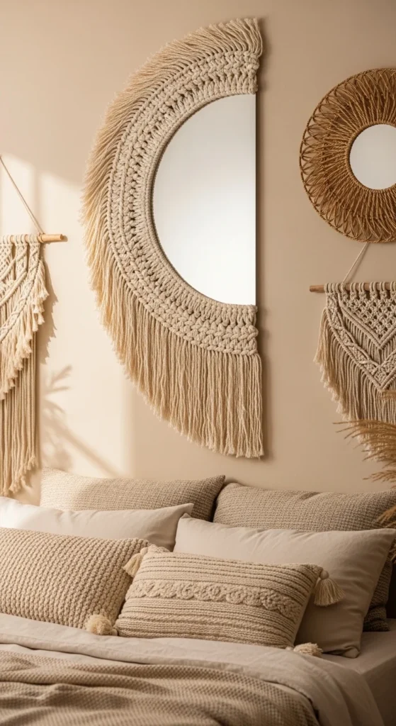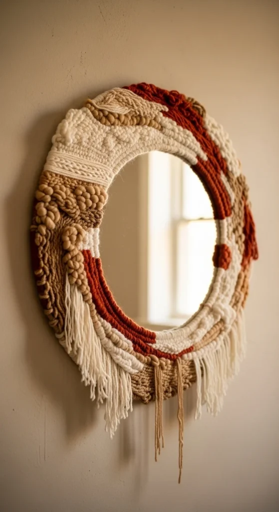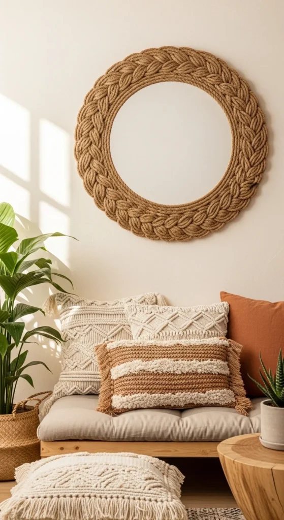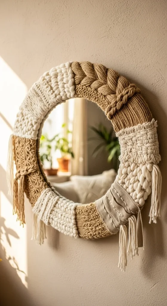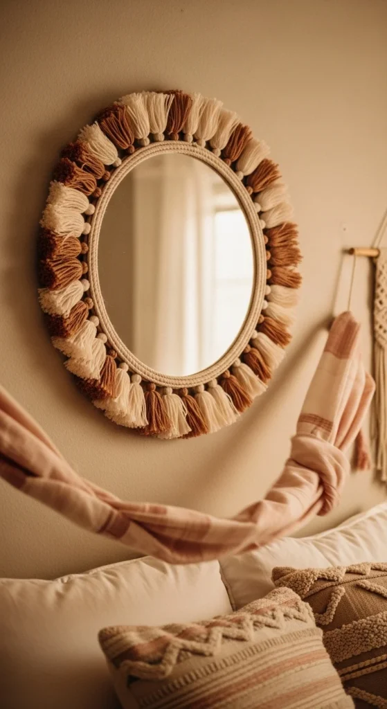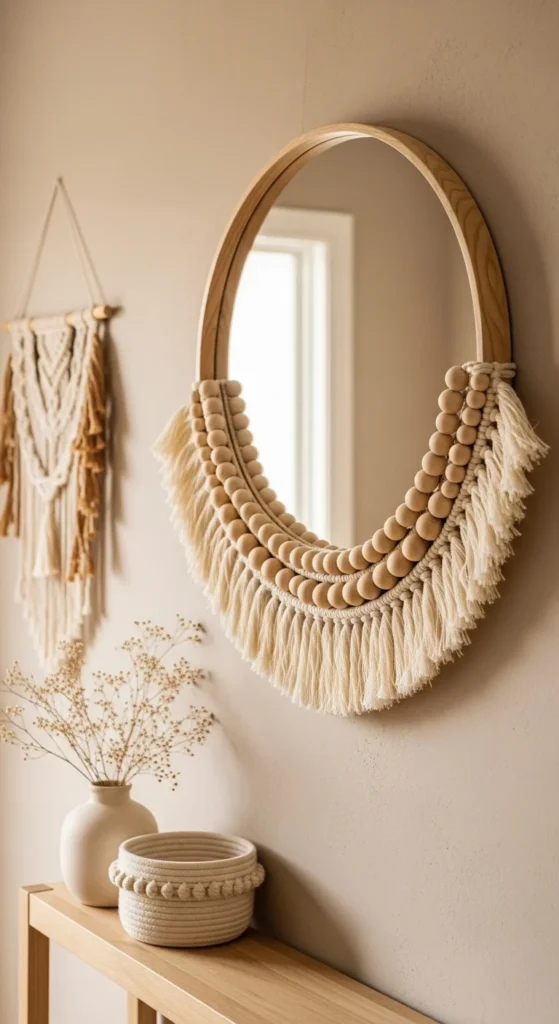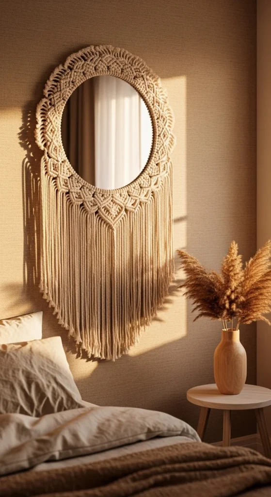 Macrame brings softness that hard frames never match. Use a basic knot pattern and repeat it evenly around the mirror. You don’t need complex designs. Consistent spacing matters more than complexity.