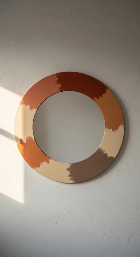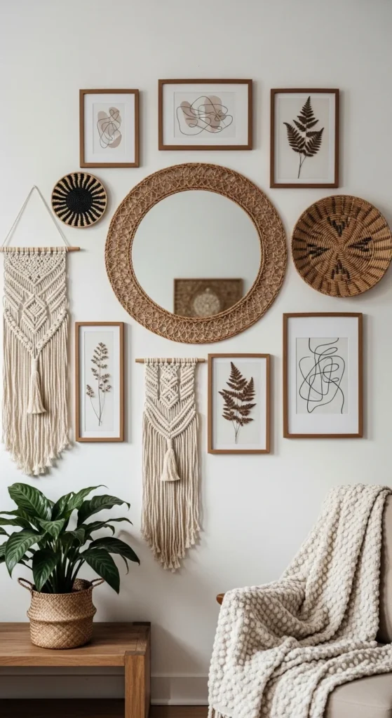 Layering adds depth without clutter. Hang the mirror slightly overlapping other pieces. Keep colors consistent so the wall reads calm.