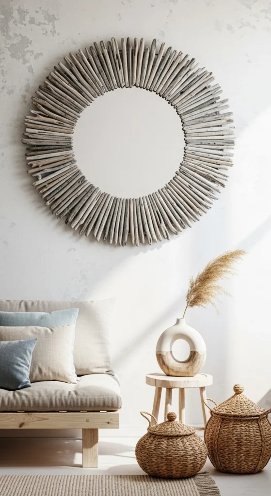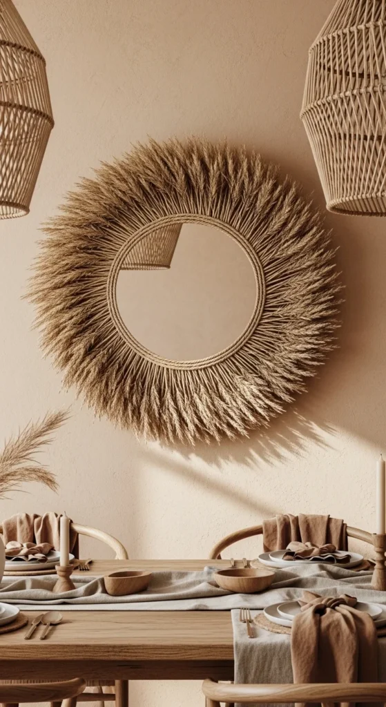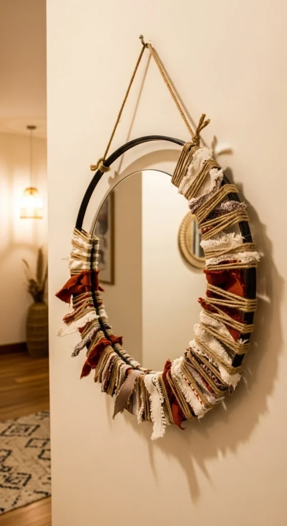This design feels artistic and relaxed. Cover only part of the frame with fiber textures. Let the mirror stay exposed elsewhere.
