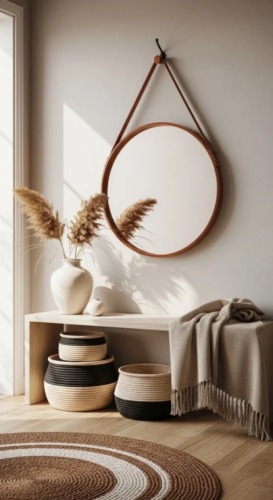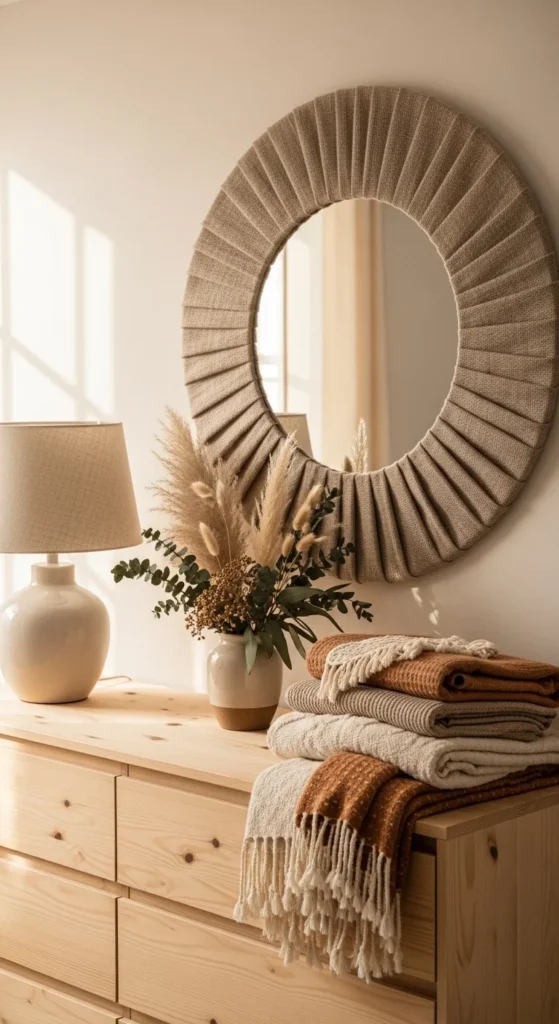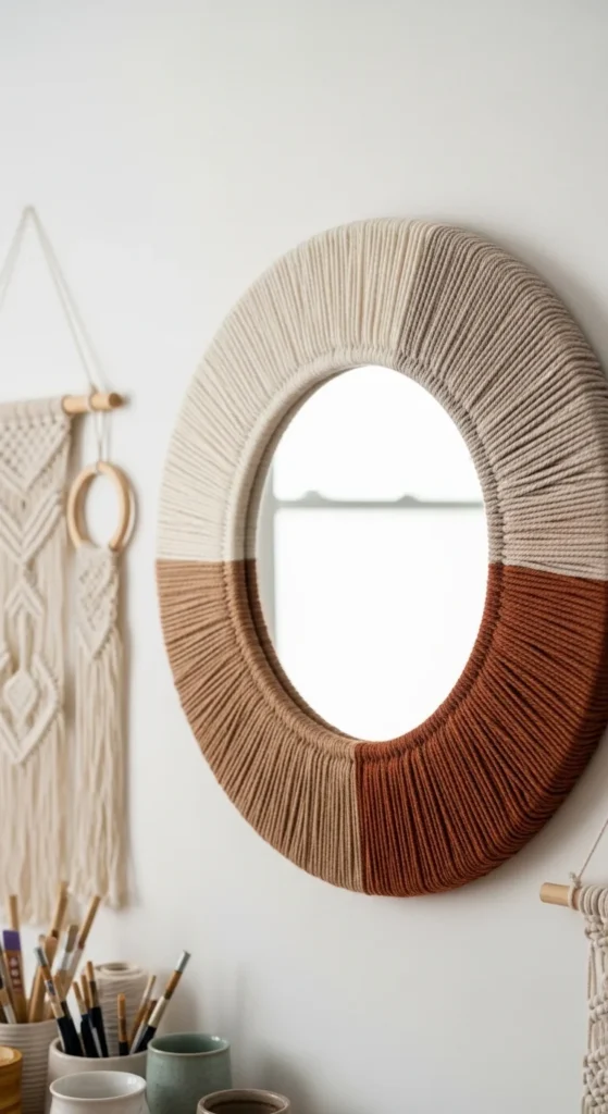 This is a classic for a reason. A plain round mirror turns cozy once the edge is wrapped in twine. Start with strong adhesive and work in short sections. Keep tension even so the wrap looks intentional, not sloppy. Natural fibers read warm on camera, which makes this project popular for small spaces.
