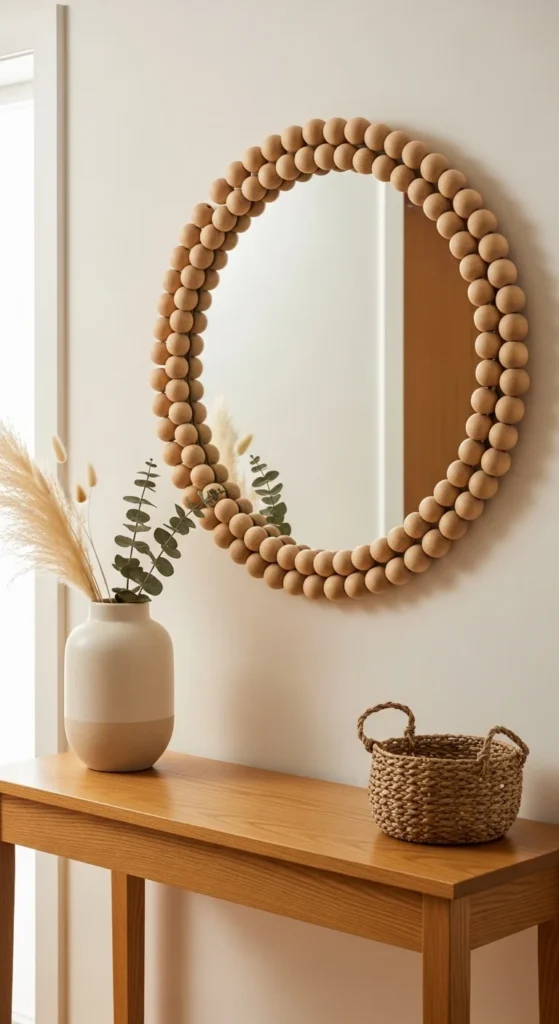 Wooden beads add rhythm and structure without feeling heavy. Thread them onto wire or strong cord before attaching to the mirror edge. Keep bead size consistent for a calm look.