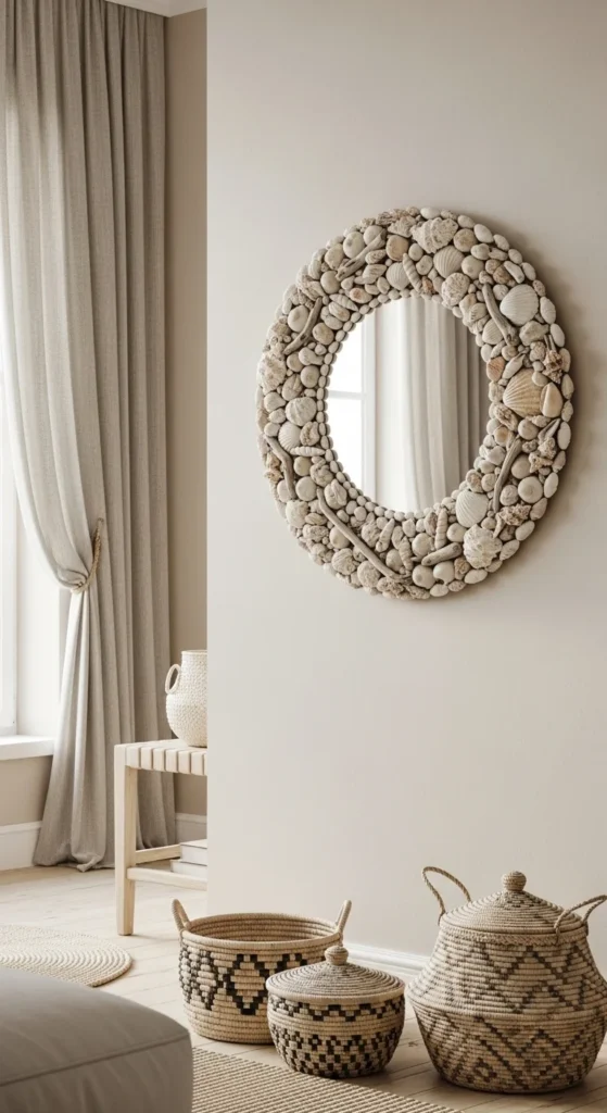 Shell accents bring a relaxed coastal note without feeling themed. Use small, similar-sized shells so the edge stays clean. Attach them close together for a continuous border. Irregular shapes add character, so don’t over-sort.