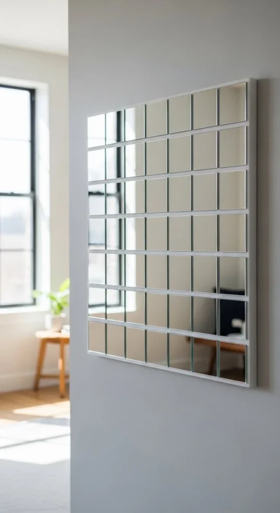 Grouping small mirrors creates an oversized statement on a budget. Start by arranging Dollar Tree mirrors on a foam board for easy alignment. Use hot glue for a quick hold or construction adhesive for durability. Painting the backing helps seams disappear and adds cohesion. This style brightens entryways or living areas. Spacing should be consistent, and a single large panel simplifies hanging. Keep furniture low-profile nearby to let reflections open the room. Black-painted seams create subtle contrast, while white or neutral tones maintain minimalism. This is a budget-friendly DIY that feels high-end. Perfect for renters, the panel can be hung with removable strips without damaging walls. Square layouts feel structured and intentional. Lighting impacts how mirrors shine, so place near windows or lamps. A simple console below emphasizes scale without distraction. Using foam board keeps the piece light and easy to move, while painting after assembly ensures a seamless finish. Reflections double the perception of space, making small apartments feel larger and more curated.