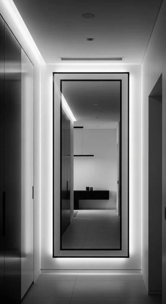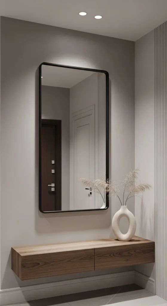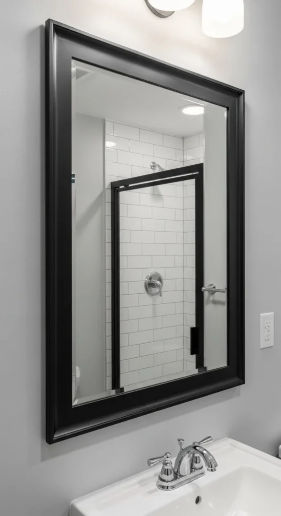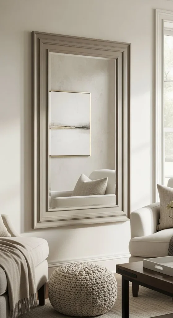 Floating frames create a sleek modern mirror look with subtle depth. Use thin wood strips or foam board for frame. Attach to mirror edges with strong adhesive. Works in hallways, bathrooms, or bedrooms. Matte black or dark finishes emphasize reflections. Lightweight backing simplifies wall mounting. Keep surrounding furniture minimal to enhance floating effect. Accurate mitered corners improve clean lines. Soft lighting highlights depth subtly. This DIY provides a high-end aesthetic on a budget. It’s quick, beginner-friendly, and versatile across rooms. Reflective surfaces enhance natural light and room perception.