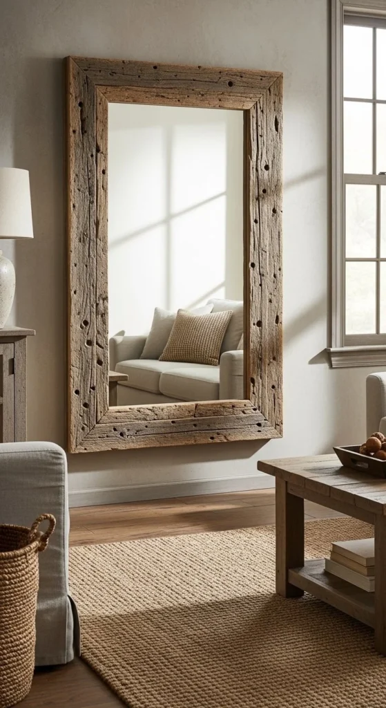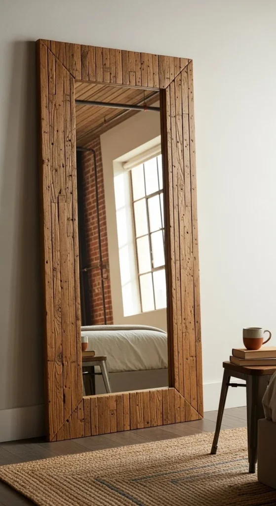 Reclaimed wood adds rustic charm and height. Vertical slats create a tall, narrow effect. Attach to a lightweight backing for stability. Lean mirrors to avoid wall damage. Wood scrap mirror frames are sustainable and inexpensive. Leave imperfections for character. Sand edges smooth for safety. Works well in lofts, studios, or living rooms. Neutral wall colors complement wood tones. Arrange multiple mirrors for gallery effects. Use light stain or sealant to enhance durability. Keep nearby furniture minimal to emphasize scale. Slat thickness adds dimension. Leaning placement simplifies installation. Mirrors reflect light and enlarge the room visually.