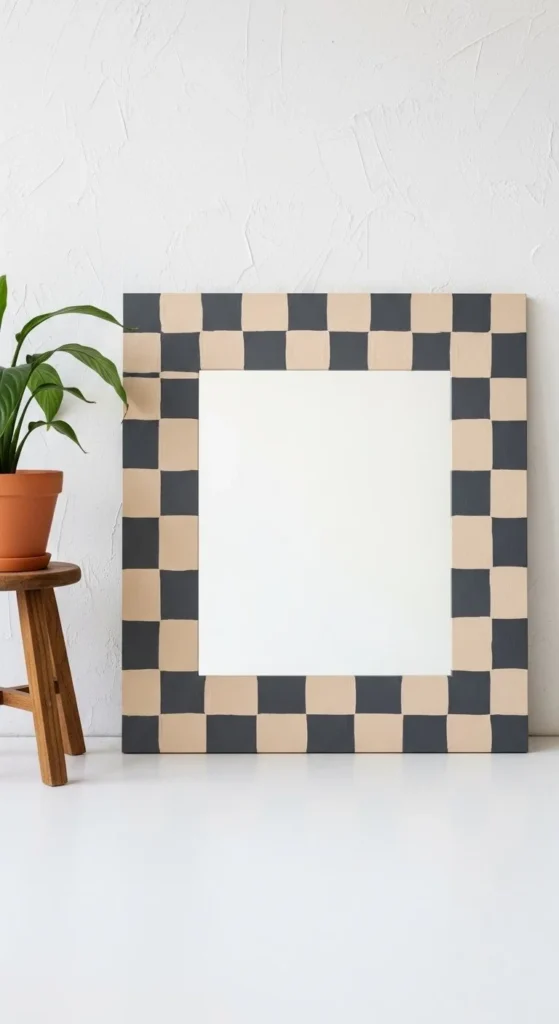 Checker frames create playful contrast. Tape squares for crisp lines. Paint in two colors for clarity. DIY mirror frames fit studios, offices, or bedrooms. Seal paint for longevity. Minimal surrounding decor highlights the pattern. Vary square size for subtle complexity. Keep colors complementary to room accents. Use lightweight backing for easier hanging. Ensure tape removal before paint dries. Matte finish reduces glare. Frame transforms inexpensive mirrors into visual centerpieces. Checker patterns can be repeated on multiple mirrors for rhythm. Works with neutral walls for maximum contrast.