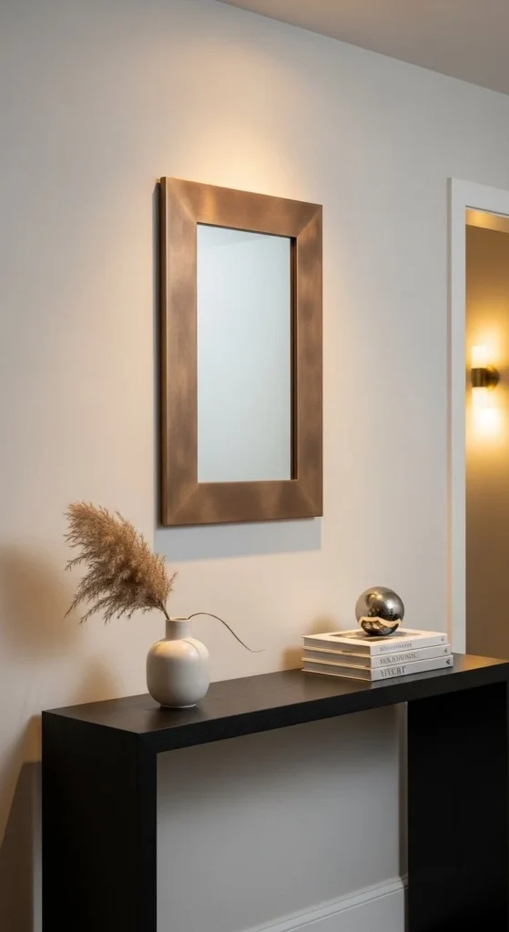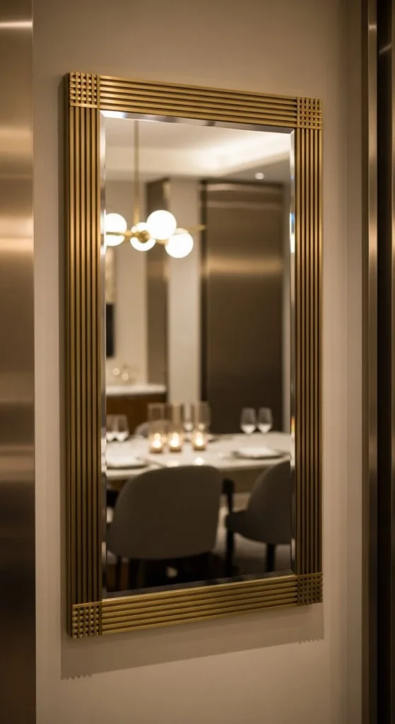 Brass strips create a high-end looking mirror quickly. Use adhesive rated for metal. Narrow strips maintain sleek proportions. Pair with dark walls for contrast. Works above buffets or consoles. Minimal furniture ensures focus. Measure carefully for tight corners. Keep strips flush to avoid shadows. Metallic paint alternatives mimic brass affordably. Use lightweight mirrors to reduce anchor stress. Clean surfaces before gluing. Reflective strips catch light, adding subtle glamour. DIY-friendly for beginners, brass strips transform a simple mirror into a sophisticated centerpiece.