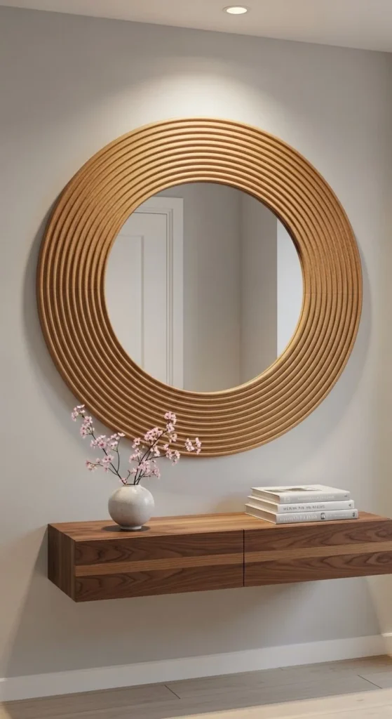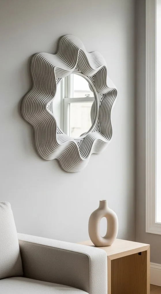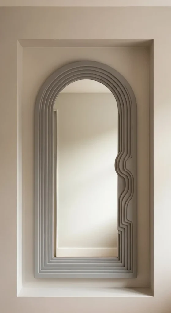 Layered foam adds depth and curves cheaply. Cut arcs progressively for smooth edges. Beginner-friendly mirror decor fits narrow spaces. Paint layers after assembly for consistency. Lightweight backing prevents warping. Neutral colors keep focus on shape. Works well in hallways, entryways, or bathrooms. Layering allows experimentation with pattern and dimension. Secure with removable strips or tape. Minimal furniture emphasizes arches. Foam is easy to cut and manipulate. The final look feels custom without heavy tools. Curves contrast straight architecture for interest.