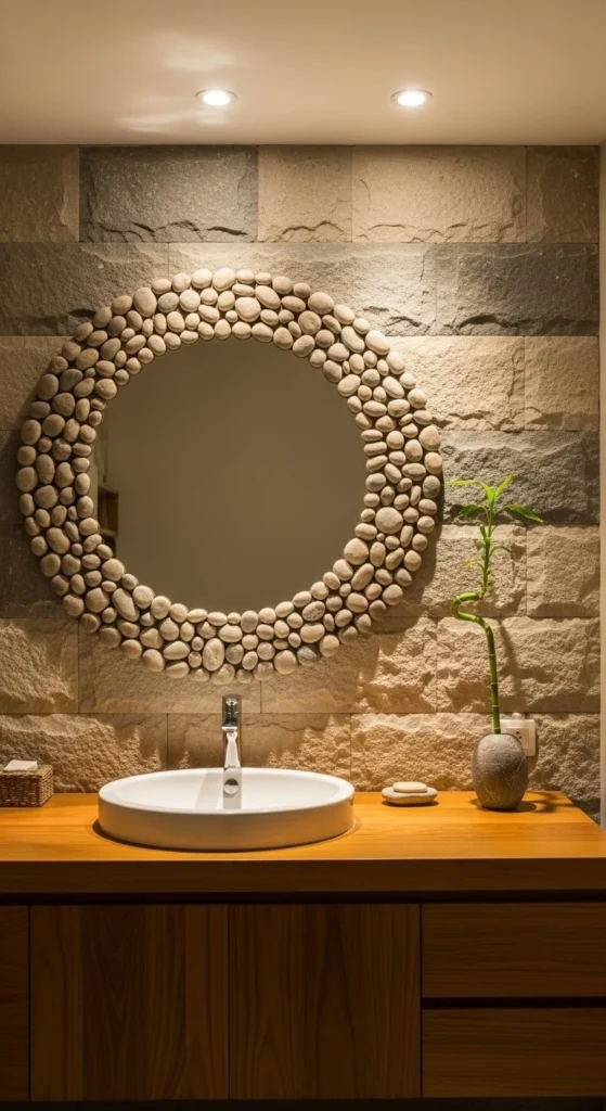 Pebbles add tactile detail and organic shape. Arrange by size for visual balance. Bathroom mirror makeovers benefit from sealed grout for durability. Use lightweight adhesive to attach stones. Natural tones complement sand-colored walls. Pebbles create a subtle focal point without overwhelming space. Soft lighting highlights texture. Works in bathrooms, powder rooms, or spas. Keep the surrounding decor minimal. Grout fills gaps and enhances cohesion. Smooth pebbles prevent snagging on towels. Securely hang the mirror to support extra weight. Use a neutral frame behind pebbles to unify design. The tactile surface contrasts smooth glass, adding interest.