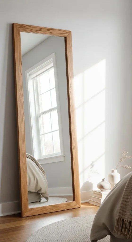 Leaning mirrors create scale without wall anchors. Large mirror decor opens small rooms visually. Use simple frames to let size impress. Ensure the top is secured against the wall for safety. Works well in bedrooms, living rooms, or dressing areas. Neutral walls enhance reflections. Minimal surrounding furniture emphasizes size. Wood finish adds warmth. Avoid heavy frames for easier movement. Place near windows to maximize light. Leaning also allows repositioning for seasonal decor. Reflective surfaces enlarge spaces. Minimalist styling keeps focus on mirror impact. Wood grain adds tactile visual interest. DIY-friendly for beginner carpenters.