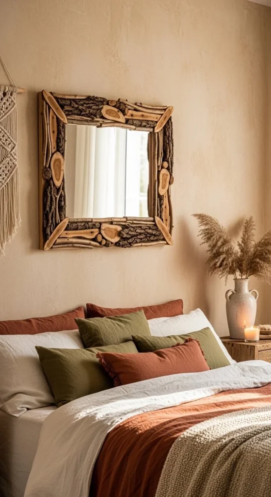 Rustic stick frames add texture and character instantly. Collect sticks of varying thickness, then trim ends flat to fit snugly around the mirror. Dry-fit all pieces before gluing. Hot glue is fast, wood glue is stronger for heavier mirrors. Eco-friendly mirror upcycles pair well with plants and woven textiles. Leaving bark exposed adds contrast against painted walls. Lightly seal with matte spray to prevent shedding. Imperfect spacing enhances charm rather than looking messy. Stick frames fit bedrooms, reading nooks, and living areas. Neutral wall colors make textures pop, and minimal surrounding decor keeps the focus on the frame. Layering sticks or combining them with small wooden shapes adds depth. Stick frames are low-cost, beginner-friendly, and easy to customize with stains or paint. Arrange multiple mirrors together for a boho gallery effect. Ensure the wall can support weight or consider a lightweight backing. The final look is casual yet curated, blending nature with indoor design effortlessly.